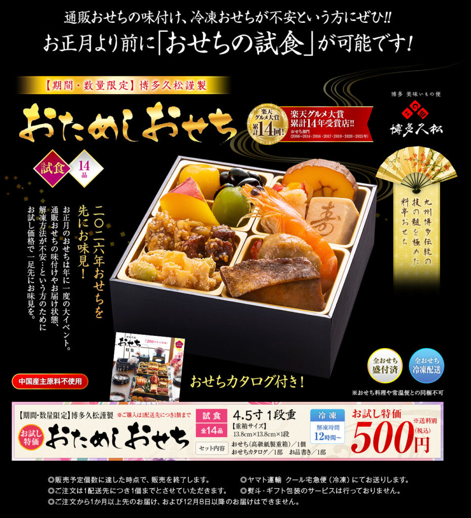 そんな方のために、博多久松はたった500円(送料無料)で「おためしおせち」を提供しています。これは、お正月前に博多久松の味を確かめられる、非常に嬉しいサービスです。