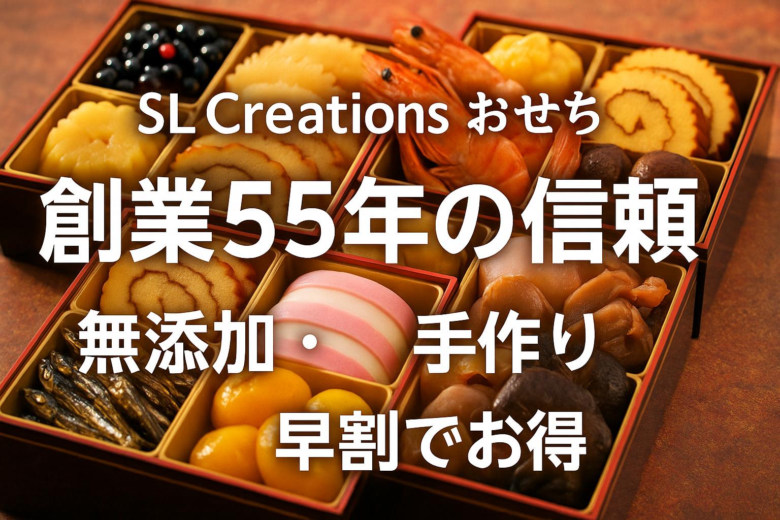 そんな悩みを抱えるあなたに、自信を持っておすすめしたいのが、創業55年の実績と信頼を誇るSL Creations(エスエルクリエーションズ)のおせちです。